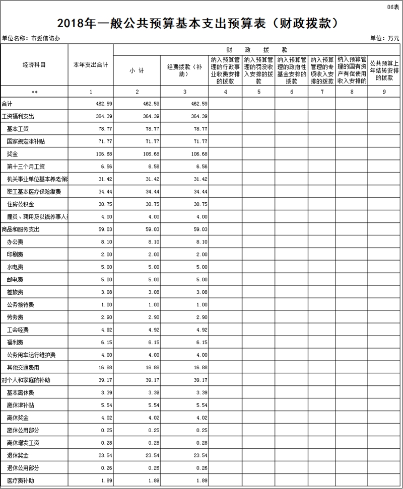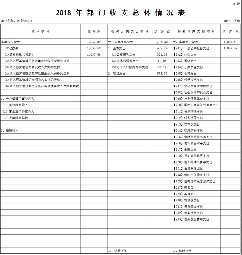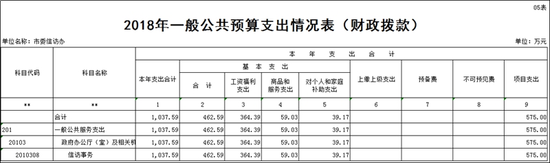2018年預(yù)算收入總計(jì)1037.59萬元,本年支出1037.59萬元,其中基本支出462.59萬元,包括工資福利支出364.39萬元、商品和服務(wù)支出59.03萬元、對個(gè)人和家庭補(bǔ)助支出39.17萬元;項(xiàng)目支出575萬元,包括解困資金20萬元、信訪維穩(wěn)專項(xiàng)經(jīng)費(fèi)55萬元、新建黃石市群眾信訪服務(wù)中心500萬元。