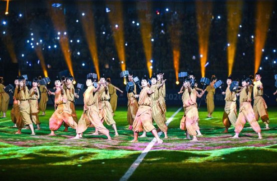 夜幕輕垂,開幕式以青銅鼎為視覺核心,將黃石三千年青銅文脈與足球激情相融。靜態(tài)的文藝展演底蘊(yùn)悠長,衣袂流轉(zhuǎn)間盡是“點(diǎn)石成金”的歷史厚重,與賽場外球迷的熱烈身影相映,靜中藏韻,美而不燥,每一處細(xì)節(jié)都彰顯著荊楚大地的文化底氣,這是一場光之盛宴,亦是一次影之舞蹈。