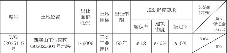 WG(2025)15號地塊建筑性質(zhì)為工業(yè)廠房、配套用房,配套設(shè)施用地面積不超過出讓用地面積的7%,建筑面積不超過總建筑面積的15%;行業(yè)及投資條件:西塞山區(qū)發(fā)改局明確該項目畝均投資強度≥250萬元/畝,稅收畝均不低于15萬元/畝;環(huán)保條件:西塞山區(qū)生態(tài)環(huán)境分局明確該項目符合環(huán)評審批要素要求。該地塊涉及的權(quán)屬及征地補償拆遷安置等事宜由工業(yè)園區(qū)管委會負責。