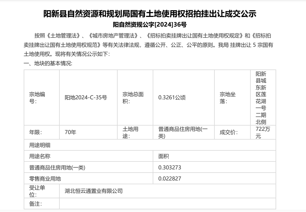 陽新縣自然資源和規劃局國有土地使用權招拍掛出讓成交公示 陽自然資規公字[2024]36號