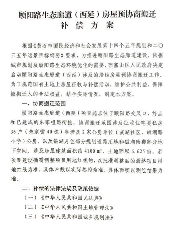 12月7日,西塞山區人民政府印發通知,啟動頤陽路生態廊道(西延)項目房屋預協商搬遷工作。根據《黃石市國民經濟和社會發展第十四個五年規劃和二〇三五年遠景目標綱要》要求,為推進頤陽路生態廊道建設,依據城市規劃及頤陽路生態環境優化的需要,西塞山區人民政府決定啟動頤陽路生態廊道(西延)項目涉及的沿線房屋搬遷與補償工作。該項目起點位于頤陽路交叉口,終點和已建成的朱家咀路銜接,搬遷范圍內涉及住宅類私房36戶和2家公房單位的公房,以及銀湖月色小區部分規劃道路用地和磁湖南郡小區部分地下空間。共計擬搬遷房屋建筑面積約4100㎡,征收土地6.625畝。