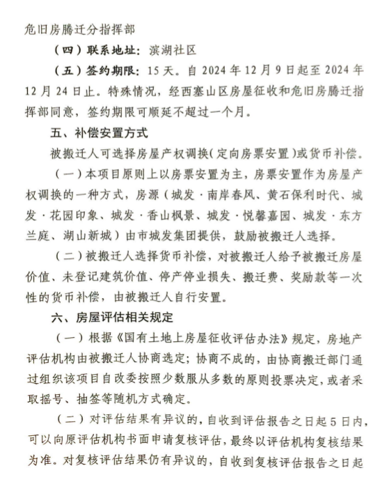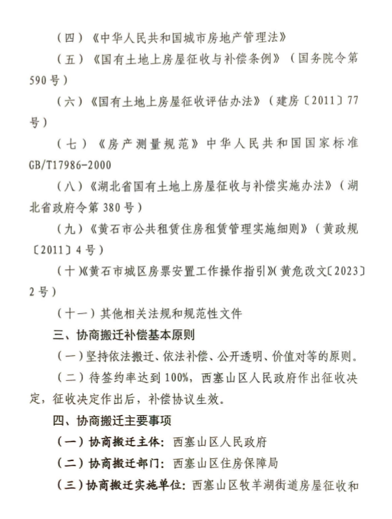 該項目房屋搬遷主體為西塞山區人民政府,搬遷部門為西塞山區住房保障局,搬遷實施單位為西塞山區牧羊湖街道房屋征收和危舊房騰遷分指揮部。預協商搬遷簽約期限為15天,自2024年12月9日起至2024年12月24日止。房屋搬遷實施單位辦公地址為濱湖社區,聯系電話為0714—6338565?!?/span>