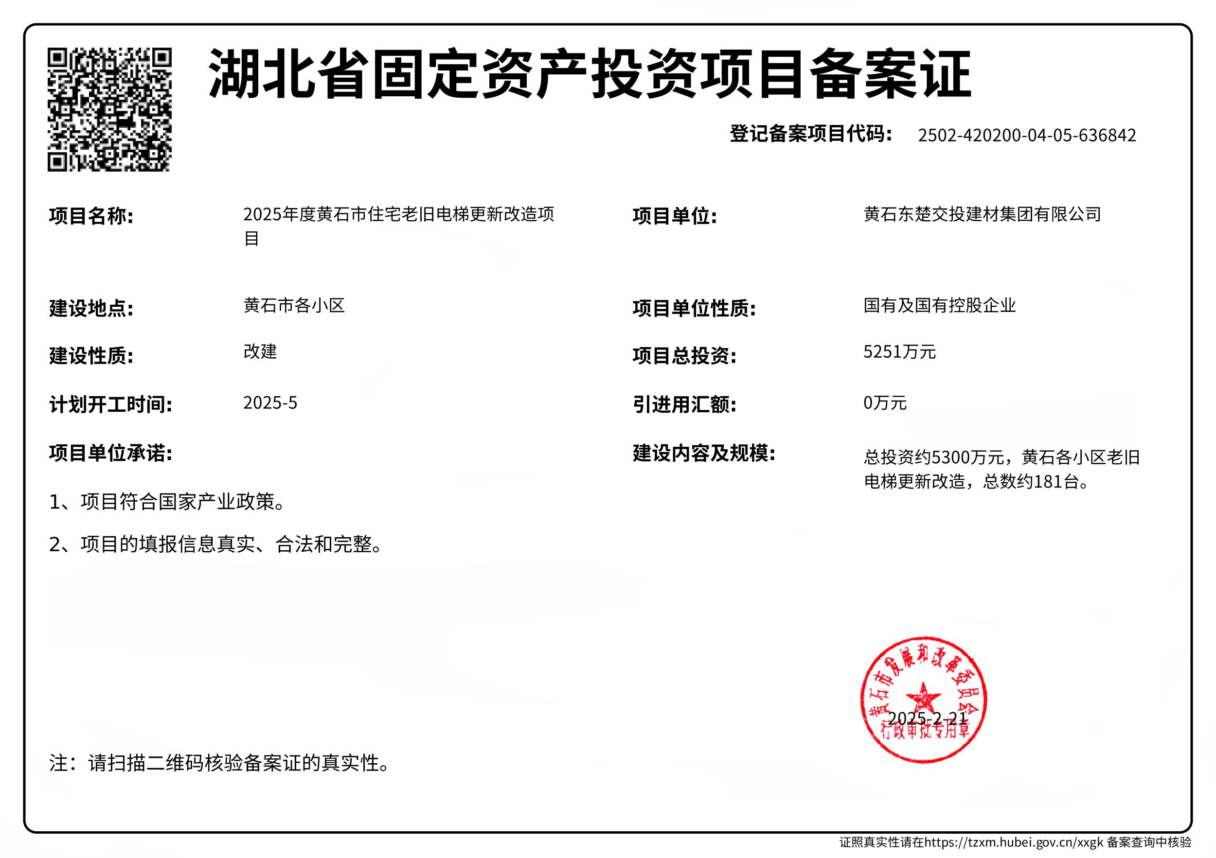 2025年度黃石市住宅老舊電梯更新改造項目備案證