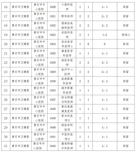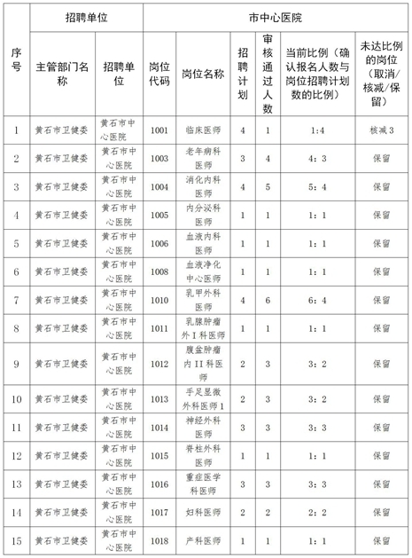 按照《黃石市中心醫院關于2024年度公開招聘事業編制工作人員的公告》(以下簡稱《公告》)關于免筆試崗位面試入圍比例的規定“對于免筆試的崗位,報名人數與崗位招聘計劃數的比例未達到2:1的,由招聘單位提出取消、核減或保留的調整申請,經主管部門核準后,通過網站公布調整情況”。根據資格審查情況,經研究決定,對部分崗位進行取消、保留,具體如下: