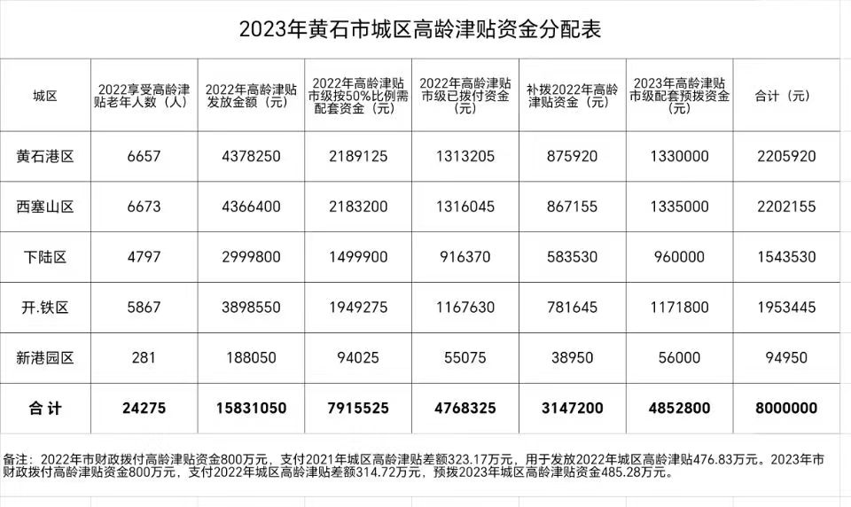 2023年黃石市城區高齡資金分配表