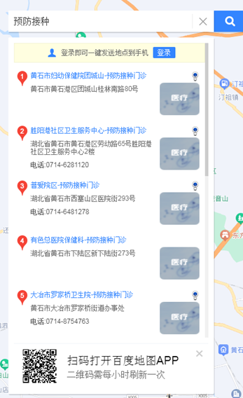 在百度地圖app或者網(wǎng)頁版上搜索預(yù)防接種,即可顯示最近的接種門診位置和電話等信息。