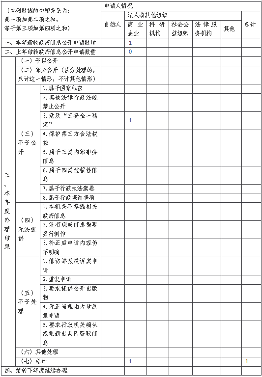 2019年,我縣嚴格按照《政府信息公開條例》和省市《政府信息公開規定》,共受理依申請公開事項1件,其中:受理當面申請1件,按規定時限和要求進行了回復。