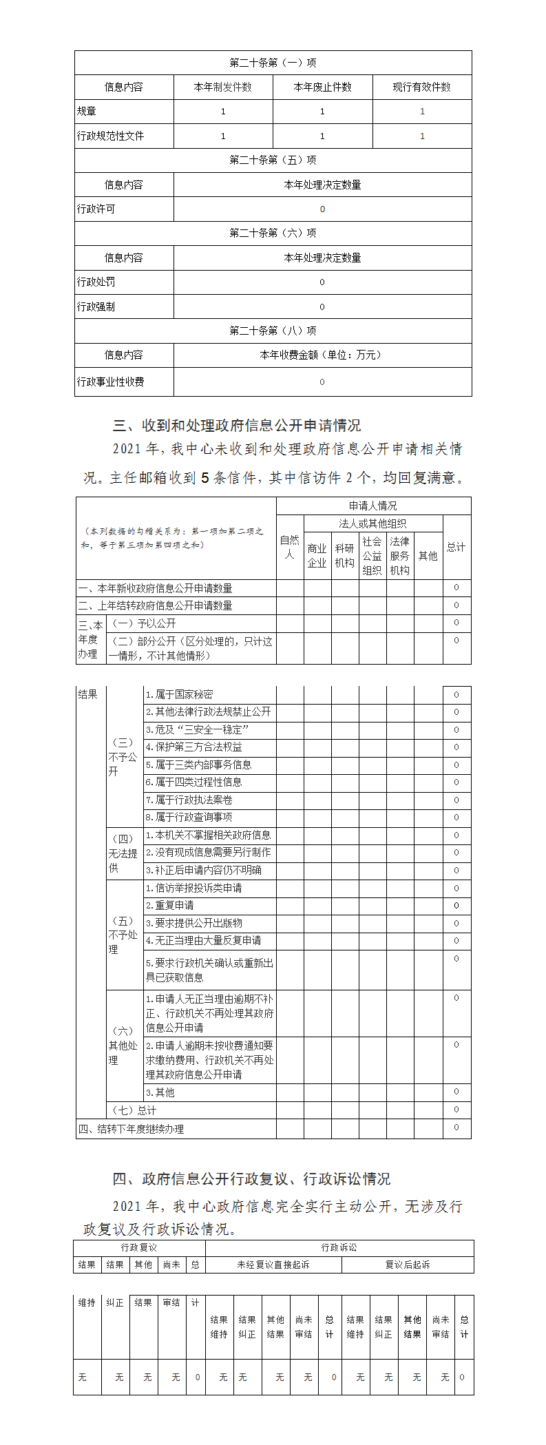 我中心沒有行政管理權(quán),未處理過行政處罰及收費情況。在建議提案辦理欄目主動公開2021年4項提案辦理回復,均回復滿意。在政府采購欄目主動發(fā)布重點項目招標公告、詢價公告、詢價結(jié)果公示等,嚴格按照《中華人民共和國政府信息公開條例》對法定主動公開內(nèi)容進行主動公開。