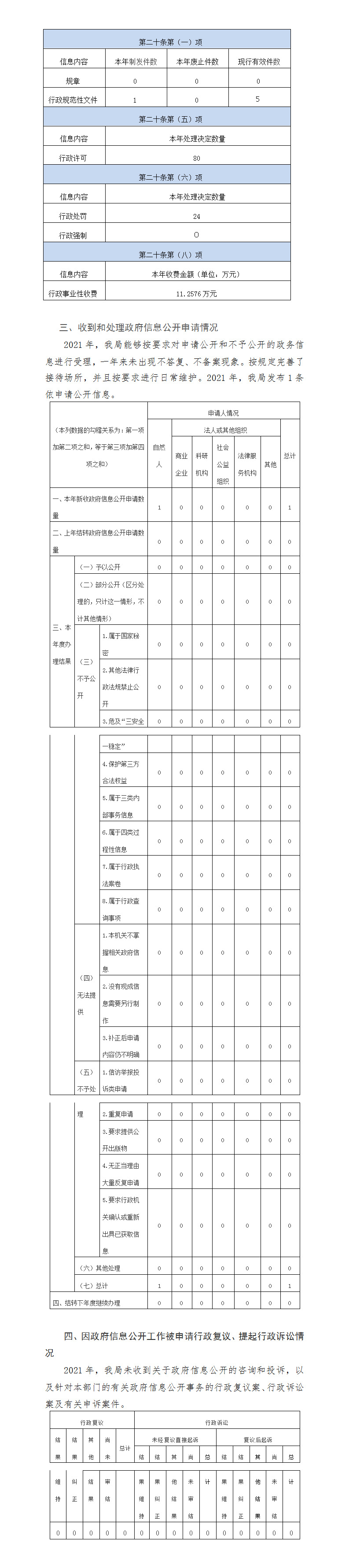 2021年,我局認真貫徹落實《中華人民共和國政府信息公開條例》規定,按照市委、市政府的部署要求,圍繞依法行政和公開、公正、規范、高效、便民、廉政、勤政的基本要求,深入推行政務信息公開工作,以公開促工作,以公開樹形象,以公開贏民心,推動我局政府信息公開工作上新水平。