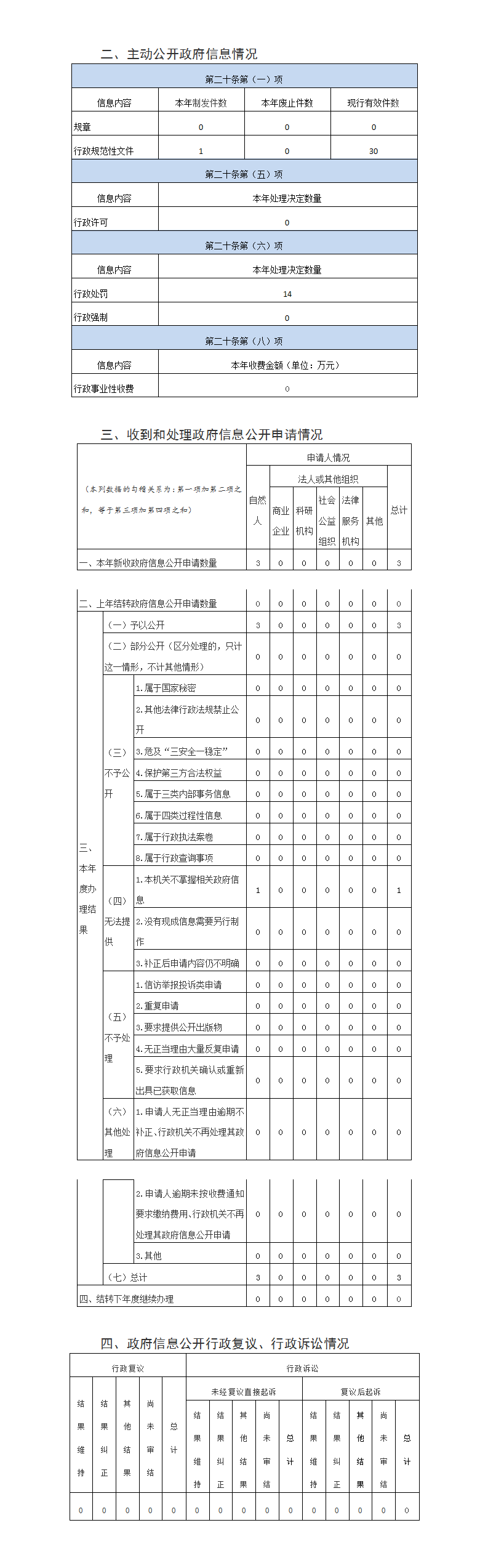 (二)規范辦理依申請公開。按照《政府信息公開申請辦理規范》要求,完善了政府信息公開申請登記、審核、辦理、答復、歸檔等工作制度,確保在線申請辦理有據可依、答復及時、記錄清晰、存檔完整。全年共收到依申請公開3件,均予以公開,答復格式符合規定格式,沒有涉及政府信息公開行政復議與行政訴訟案件。 (三)審慎管理政府信息。所有政府信息公開歸口辦公室管理,建立嚴格信息公開“三審制”,即公開信息必須通過科室(單位)、辦公室、分管領導三重審核后方可公開,以確保信息公開的準確性和權威性;網站信息公開載體均安排專人管理運維,并建立實時臺帳備查。