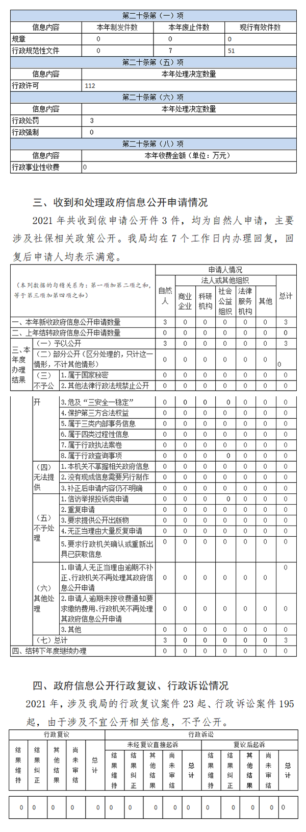 2021年我局公開行政許可5項,其中事實清單2項;公共服務(wù)32項,其中實事清單131項;其他2項,其中實事清單1項,主要涉及人力資源流動管理、職業(yè)能力建設(shè)、勞動關(guān)系相關(guān)業(yè)務(wù),公開行政許可112起、行政處罰3起。我局無行政強(qiáng)制職能,無行政事業(yè)性收費,涉及職業(yè)能力建設(shè)和人事考試領(lǐng)域收費屬公共服務(wù)事項收費,均按照相關(guān)標(biāo)準(zhǔn)執(zhí)行并進(jìn)行公開。本年度未制定規(guī)章和規(guī)范性文件。