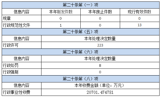 (二)執法行政公開情況。2022年行政許可處理決定數量223件,行政處罰處理決定數量8件。