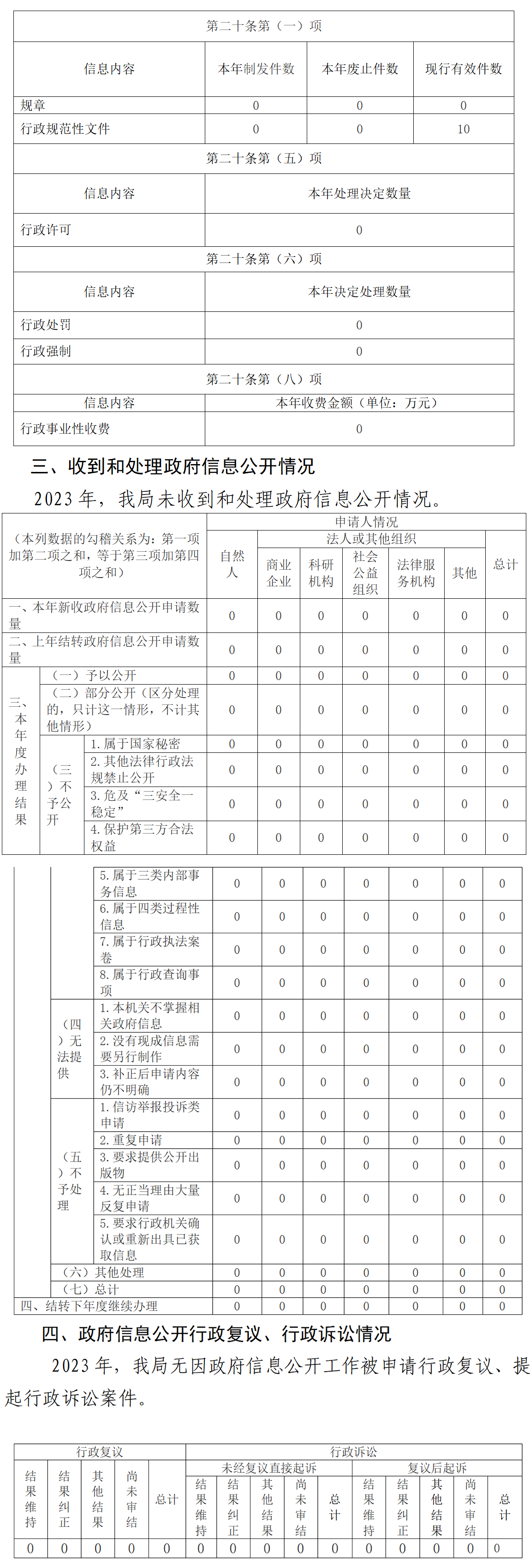 2023年,我局新制作規章0個,新制作行政規范性文件4個,先行有效件數10個,行政許可事項0個,行政處罰事項0個、行政強制事項0個。