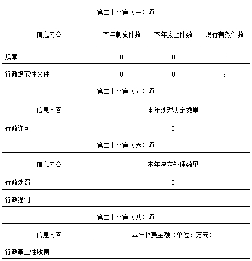 2025年,我局新制作規章0個,新制作行政規范性文件0個,廢止的規范性文件數0個,現行有效件數9個,行政許可事項0個,行政處罰事項0個、行政強制事項0個。