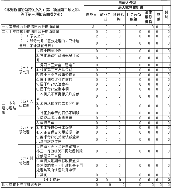全年共接收政府信息公開申請2件,全部依法依規進行辦理。本年度未發生針對政府信息公開事務的行政復議或行政訴訟。