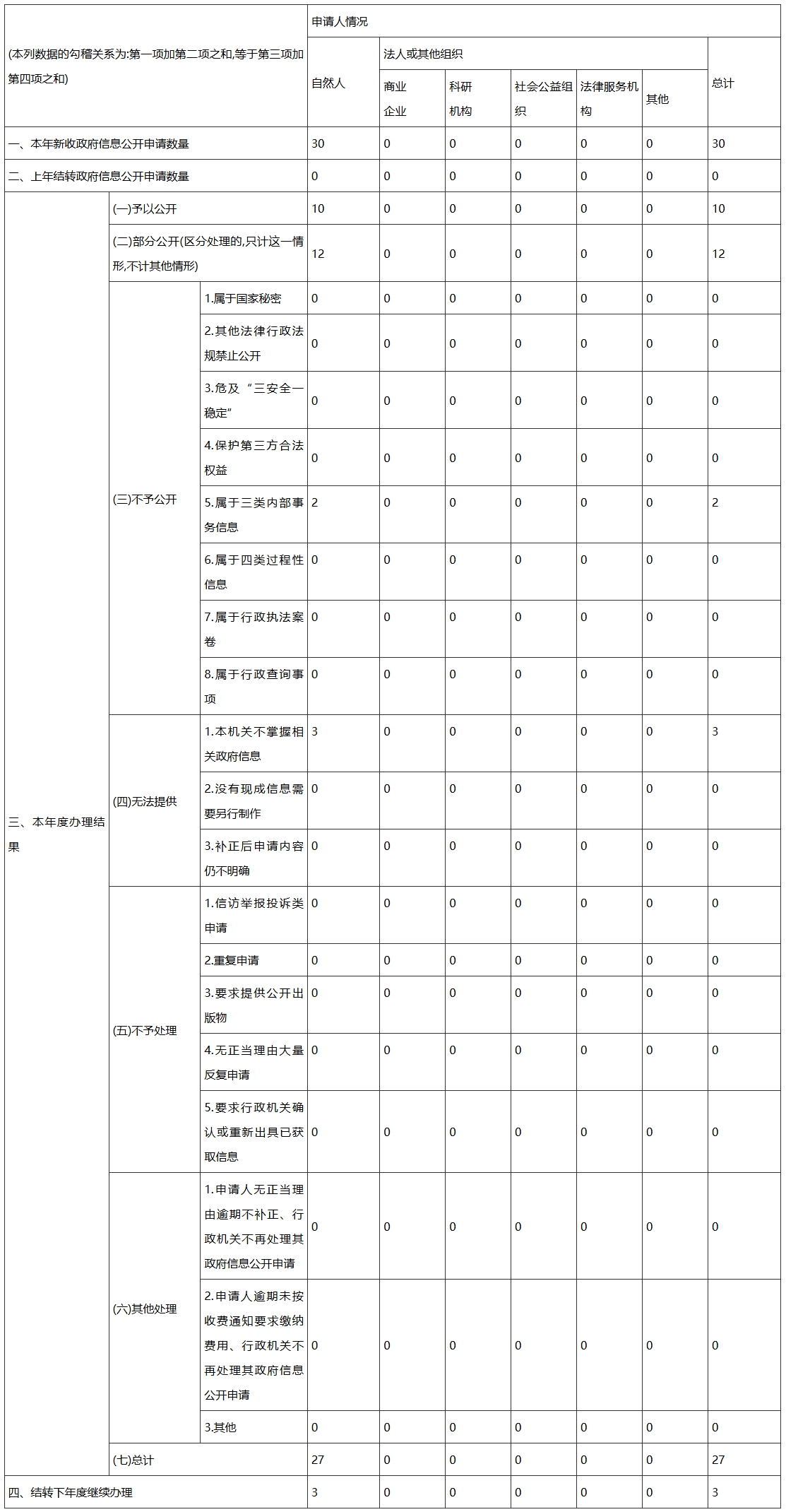 (二)政府信息依申請公開情況。嚴格按照《中華人民共和國政府信息公開條例》要求,規(guī)范依申請公開受理、審核、辦理、答復全流程管理,提升辦理質(zhì)效。一是拓寬申請渠道,依托區(qū)政府門戶網(wǎng)站,完善政府信息公開指南,明確依申請公開方式,暢通線上線下申請渠道,為群眾提供便捷高效的申請途徑。二是強化辦理規(guī)范,建立依申請公開登記臺賬,實行“一件一登記、一件一審核、一件一答復”,明確辦理時限和責任人員,加強與申請人的溝通對接,準確把握申請意圖,依法依規(guī)滿足合理訴求。對涉及多部門的申請,加強協(xié)同聯(lián)動,確保答復準確規(guī)范。全年全區(qū)共受理政府信息公開申請30件,27件已辦結(jié),辦結(jié)率90%,剩余3件,按程序流轉(zhuǎn)至下年度辦理,因依申請公開引發(fā)的行政復議1件,未因依申請公開引發(fā)行政訴訟案件。