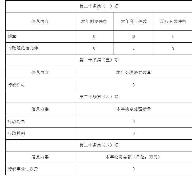 二、主動(dòng)公開政府信息情況2024年,我局新制作規(guī)章0個(gè),新制作行政規(guī)范性文件0個(gè),廢止的規(guī)范性文件數(shù)1個(gè),現(xiàn)行有效件數(shù)9個(gè),行政許可事項(xiàng)0個(gè),行政處罰事項(xiàng)0個(gè)、行政強(qiáng)制事項(xiàng)0個(gè)。
