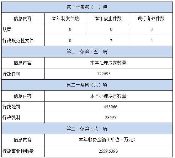 我局2024年無新增行政規(guī)范性文件,廢止2件,現(xiàn)行有效4件。行政許可數(shù)量為722693,行政處罰數(shù)量為453966,行政強制數(shù)量為28695,行政事業(yè)性收費2559.5393萬元。