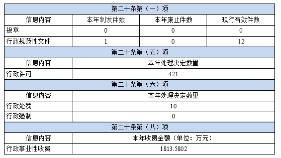 (二)執法行政公開情況。2024年行政許可處理決定數量421件,行政處罰處理決定數量10件。