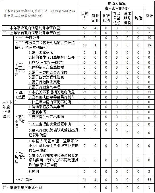 (二)政府信息依申請公開情況。為貫徹落實《政府信息公開條例》,我局結合實際建立了依申請公開制度,規范了依申請公開答復書以及回復時限等內容。2024年,通過電子郵件,網上申請、電話申請、現場申請共收到依申請公開56件,上年結轉2件,共計58件,辦理完結55件,結轉下年度3件。