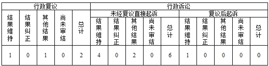 2024年,因政府信息公開提起行政復議案件2件,2件均已審結,1件駁回申請,1件確認超期回復行為違法。經復議后提起訴訟案件1件,已審結,結果為駁回起訴。未經復議提起訴訟案件6件,均已審結,1件結果為撤回起訴,1件結果確認超期回復行為違法,其余4件結果為駁回起訴或上訴。