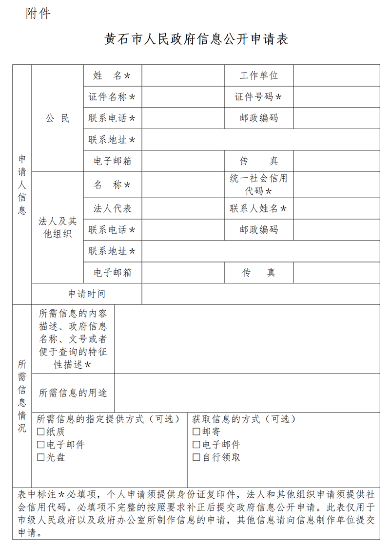 申請人可向本機關申請領取或自行復制《黃石市人民政府信息公開申請表》(附件),也可在黃石市人民政府門戶網站上下載電子版本。