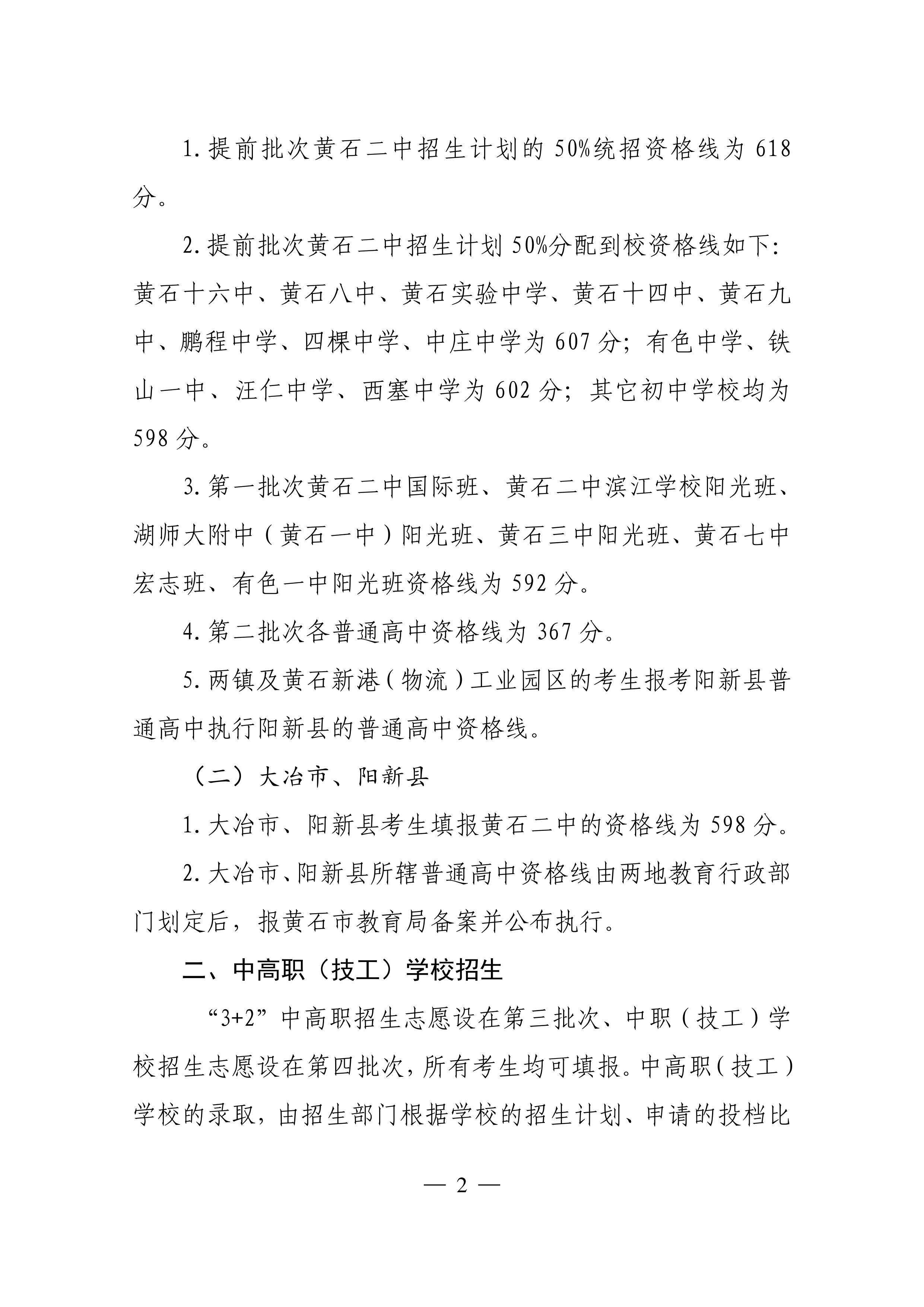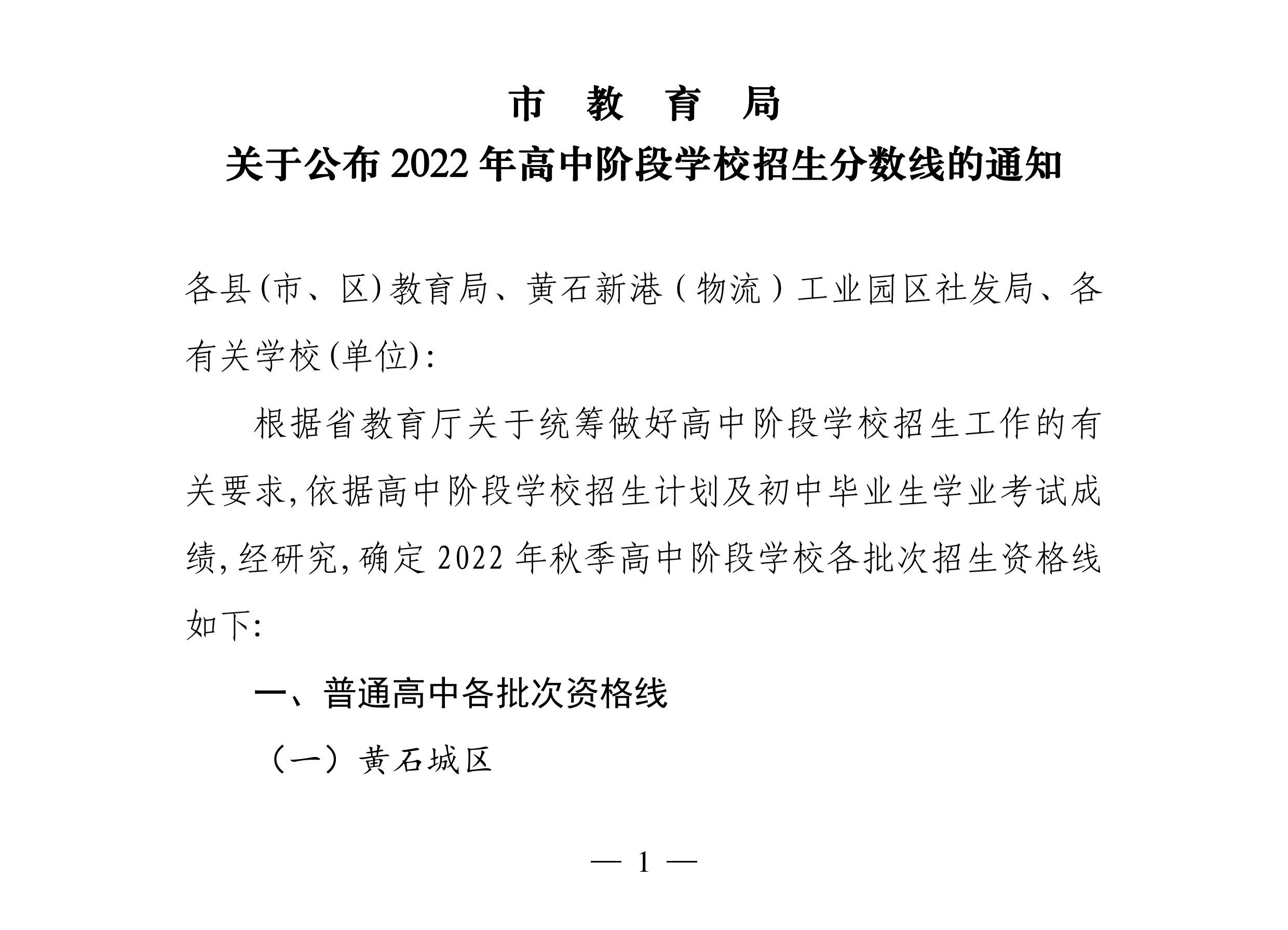 2022年黃石市高中階段招生分數(shù)線